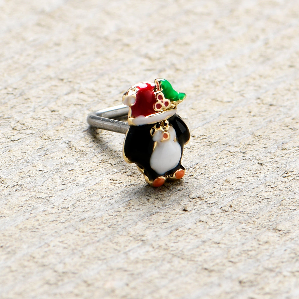 You want to dress to impress for the holidays, like the penguin on this 20 gauge nostril ring! It's made with a .27" length at the bend 316L surgical grade stainless steel L-shaped post. It features a penguin charm, with the penguin rocking its traditional black and white. The penguin is also sporting a festive Santa cap, embellished with a sprig of holly. You'll be rocking your finest when you're rocking this merry penguin nose piercing ring.Specifications