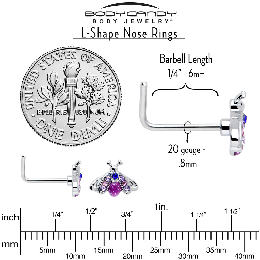 Show some love for the planet's tiny critters with this 20 gauge nostril ring. It's made with a 0.27 inch length at the bend 316L surgical grade stainless steel L-shaped post. It features an insect charm, lavishly paved with pink, purple, and blue gems and featuring a glitter inlaid purple body. Don't let boring body jewelry bug you when you can rock this extravagant, insect nose piercing jewelry.Specifications