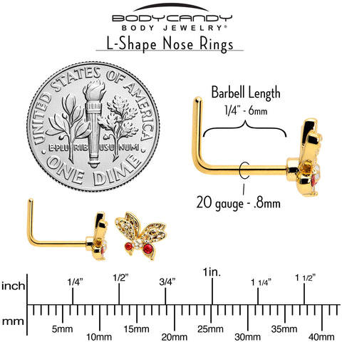 20 Gauge 7mm Red CZ Gem Gold Tone Drama Butterfly L Shape Nose Ring