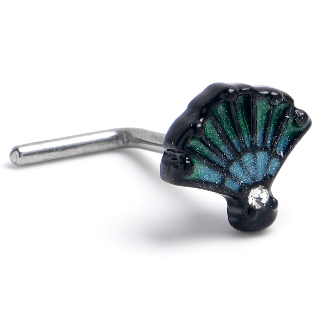 Get a look that is perfect for the beach or anywhere else with this 20 gauge nostril ring It is made with a .27 inch length at the bend 316L surgical grade stainless steel L-shaped post. It features a sea shell charm, with raised detailing. It is further embellished with a clear gem at the bottom and blue and green coloring. Be beach ready and ready for anything else when you are rocking this striking scallop shell nose piercing jewelry.
