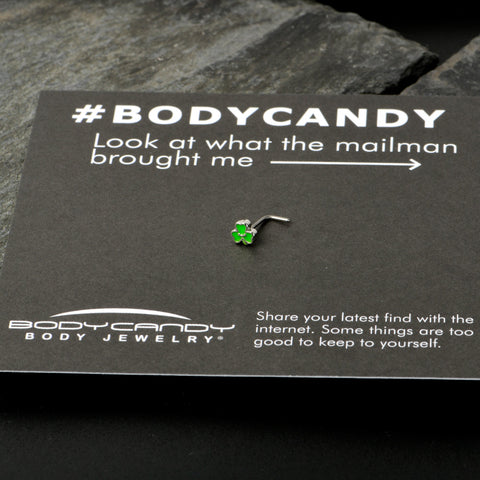 Get lucky with this 20 gauge shamrock nostril ring! It's made with a .27" length at the bend 316L surgical grade stainless steel L-shaped post. It features a green shamrock charm with a winningly cheerful face at the center. Whether you're celebrating St Patrick's Day, expressing your love of all things Irish, or simply need a little luck, this lucky shamrock nose piercing jewelry is sure to leave you feeling like a winner!