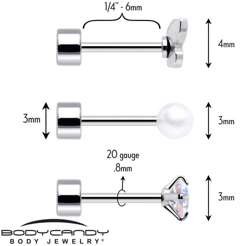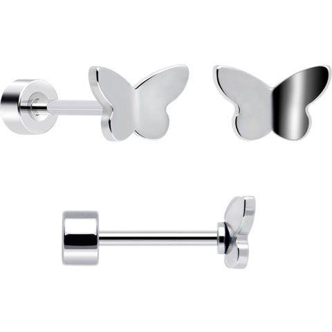 Check out these super comfortable 20 gauge flat back earrings for 24/7 wear. No need to take these earrings out; keep them in for sleeping and naps. They're made with 316L surgical grade stainless steel straight posts with flat disc ends. One pair features round aurora gems while the second pair features opaque white orbs. The third pair features butterfly charms. You'll wonder how you lived without this stylish and comfortable ear piercing jewelry. Sold as a set of six.