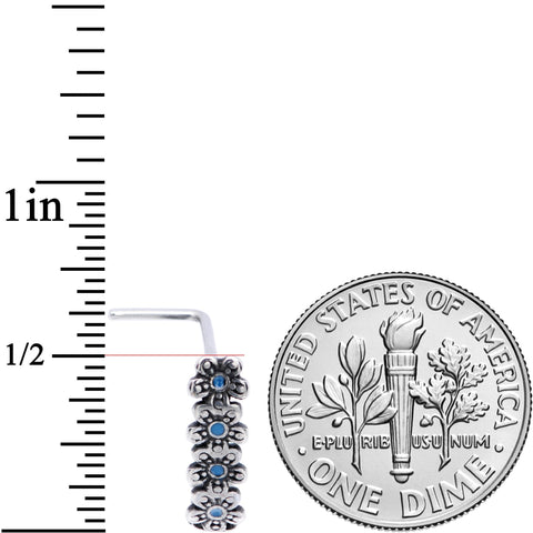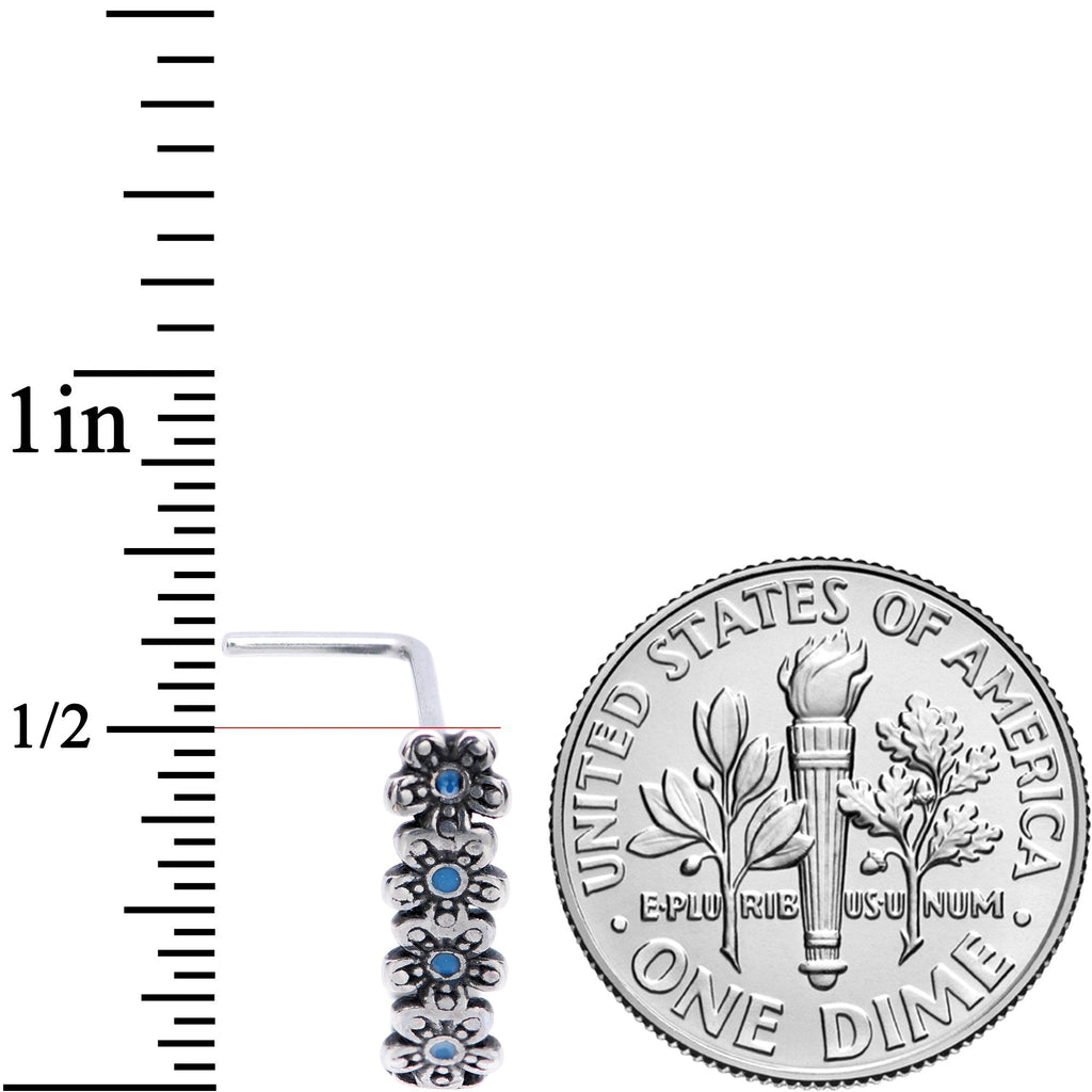 Spring is coming and flowers are popping up everywhere....even in your piercings! This 20 gauge nose piercing is made with a 6mm length at the bend durable 316L surgical grade stainless steel L-shaped post. It features a row of tiny little flowers with blue inlay centers. They have a sweet, feminine look that is perfect to accessorize your piercing without detracting from your own natural beauty. This nose jewelry gives the look of a hoop but with the ease and fit of a nostril stud. So pop this in your piercing and let your garden grow!Specifications
