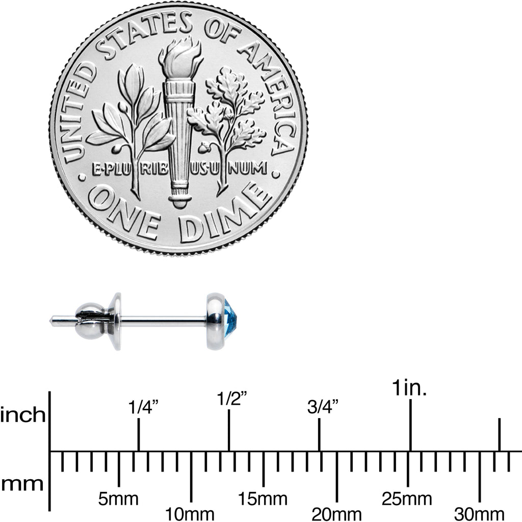 Get a timeless look with this pair of 20 gauge stud earrings! These fashion earrings are made with 7/16" ASTM F-136 titanium posts and feature 4mm blue gems for a classic and elegant appearance. These earrings for women also feature butterfly-style friction backs for a secure fit. Stay stylish without sacrificing quality with this super sweet set of stud earrings! Sold as a set of two.