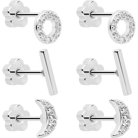 You'll have endless style options with this set of hypoallergenic 20 gauge flat back earrings. They're 1/4 inch posts and are entirely made with 316L surgical grade stainless steel. The front ends feature one pair with a simple bar charm, one pair with elegant circle charms that are set with clear cubic zirconia gems, and a pair with timeless crescent moon charms which are also paved CZs.