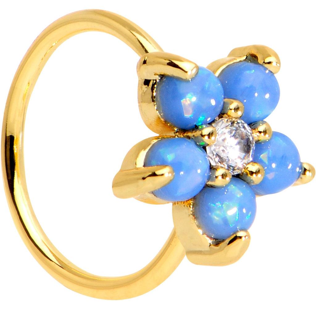 If you're into floral style this pretty 20 gauge nostril ring is right up your alley. Made with an adjustable 8mm gold IP over 316L surgical grade stainless steel circular ring, this nose hoop features a flower charm formed from light blue faux opals and a clear cubic zirconia center gem. This universal jewelry features ends that can be twisted open and then twisted shut again to easily to fit into your nose piercing. This universal body jewelry can be used for multiple piercings including your nostril, cartilage, or any other place that is a perfect fit for you!