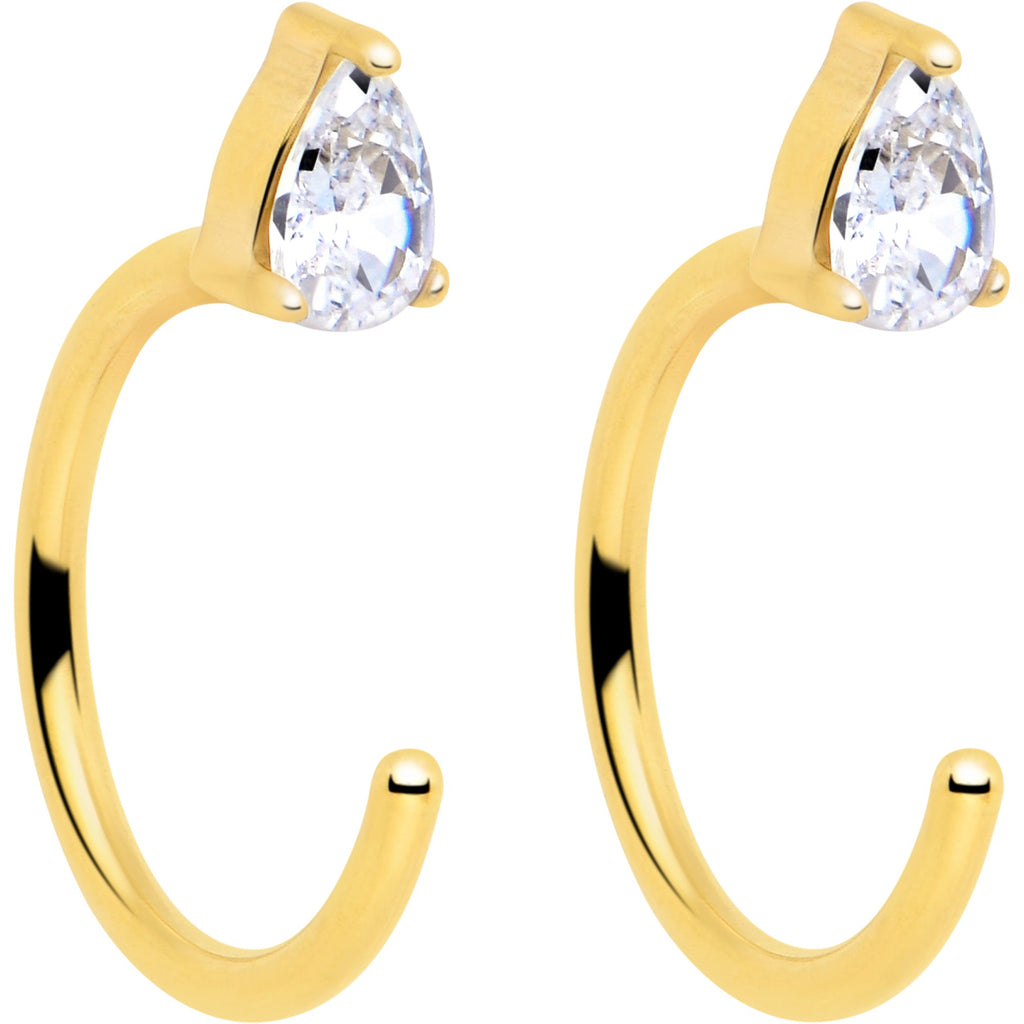 Minimalist open hoop earrings. These tiny half hoop earrings are hypoallergenic. Triple your style with these 20 gauge hoop earrings for pierced lobes. They're made with 0.27 inch ASTM F-136 implant grade titanium circular rings. Each one features a clear gem triangle charm for classic style. These understated pierced earrings are a perfect new look to try. Sold as a set of two.