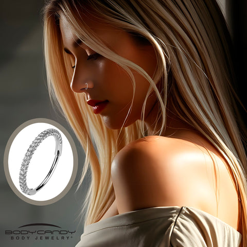 Add a look of sophistication to your nose piercing or ear with this 20 gauge implant grade titanium hinged nose ring piercing! The bottom arc of this 8mm tragus ring is paved with cubic zirconia gems on both the front and sides of the hoop for a look that's totally attention-getting without being over-the-top.