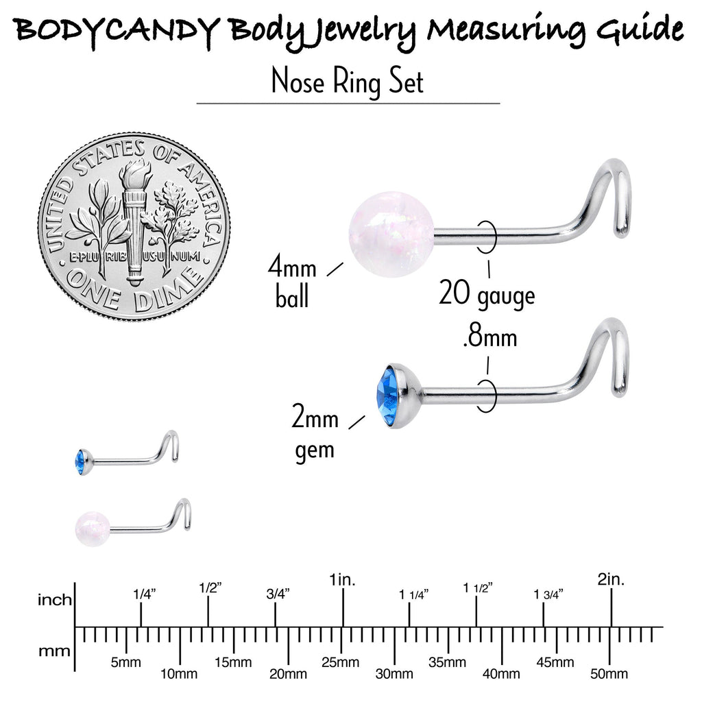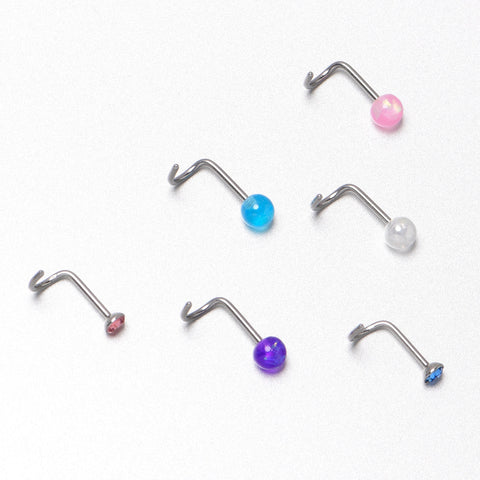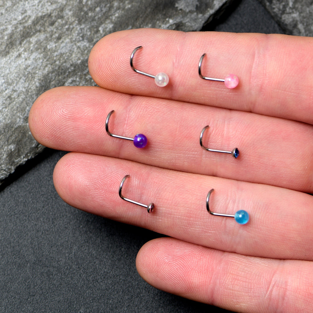 Simple colors can be simply stunning with these 20 gauge nostril rings. They are made with 6mm durable 316L surgical grade stainless steel posts. Each one features a different embellishment. One has a pink gem end while another features a blue gem end. You also get one with a pink faux opal, one with a light blue faux opal, one with a white faux opal, and one with a purple faux opal. They are designed for a left side nostril piercing and also have a curving design that makes for comfortable wear. Keep it basic but beautiful with this charming nose piercing jewelry. Sold as a set of six.Specifications
