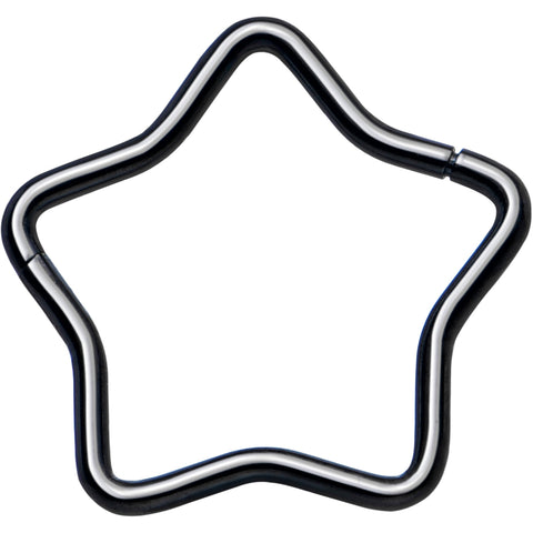 Hypoallergenic nose hoop is lightweight and comfortable. This 20G star hoop body jewelry piercing can be worn as an earring, septum or nose ring. Hinged segment clicker nose ring. Surgical steel hollow star hinged nose ring.