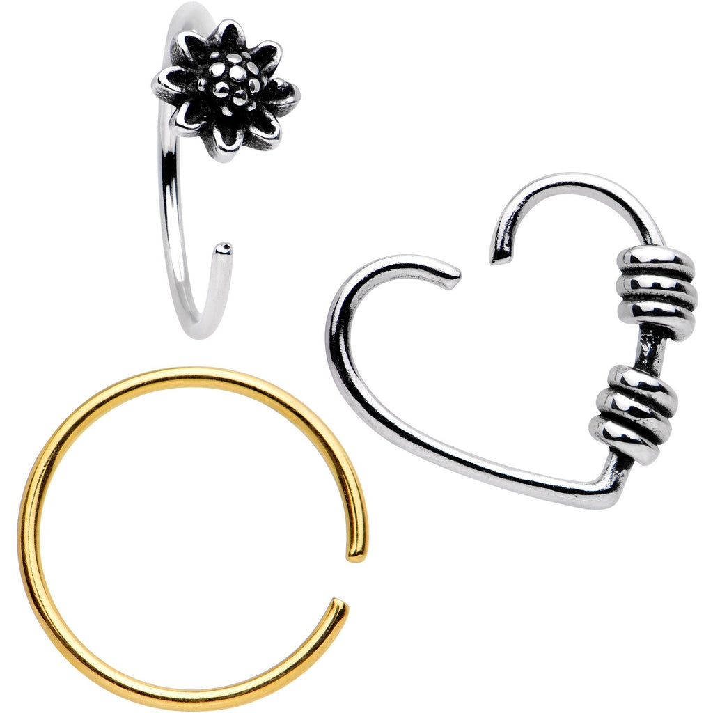 You'll have a ton of options if you pick up this awesome set of three nose and cartilage earrings. This set features a circular nose hoop made with durable 316L surgical grade stainless steel and complete with a splendid flower charm. The pack also comes with a 20 gauge, 3/8" circular hoop made with gold PVD over 316L surgical grade stainless steel. Finally, the pack comes with a 20 gauge heart-shaped closure hoop made with 3/8" durable 316L surgical grade stainless steel. Sold as a set of three for you!