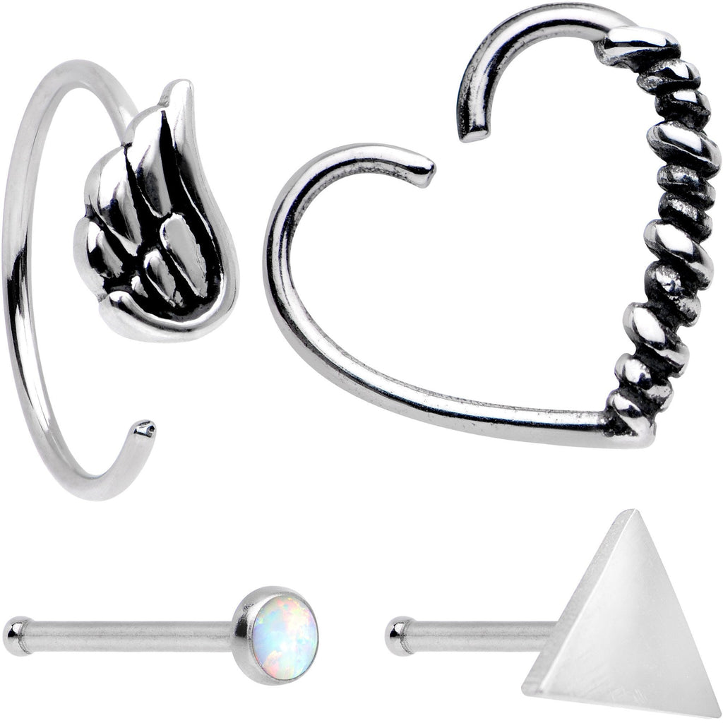 You'll have a ton of options if you pick up this awesome set of funky nose rings with a heart earring too. This set features two nose bone-style rings; one with a white faux opal end, and one with a triangle end design. Both 20 gauge nose bones are made with durable 316L surgical grade stainless steel and are 1/4" in length. The pack also comes with a 20 gauge, 3/4" heart-shaped closure earring made with 316L surgical grade stainless steel and complete with a funky, twisted metalwork design. Finally, the pack comes with a 20 gauge circular ring made with 3/4" durable 316L surgical grade stainless steel and featuring an eagle's wing end charm.