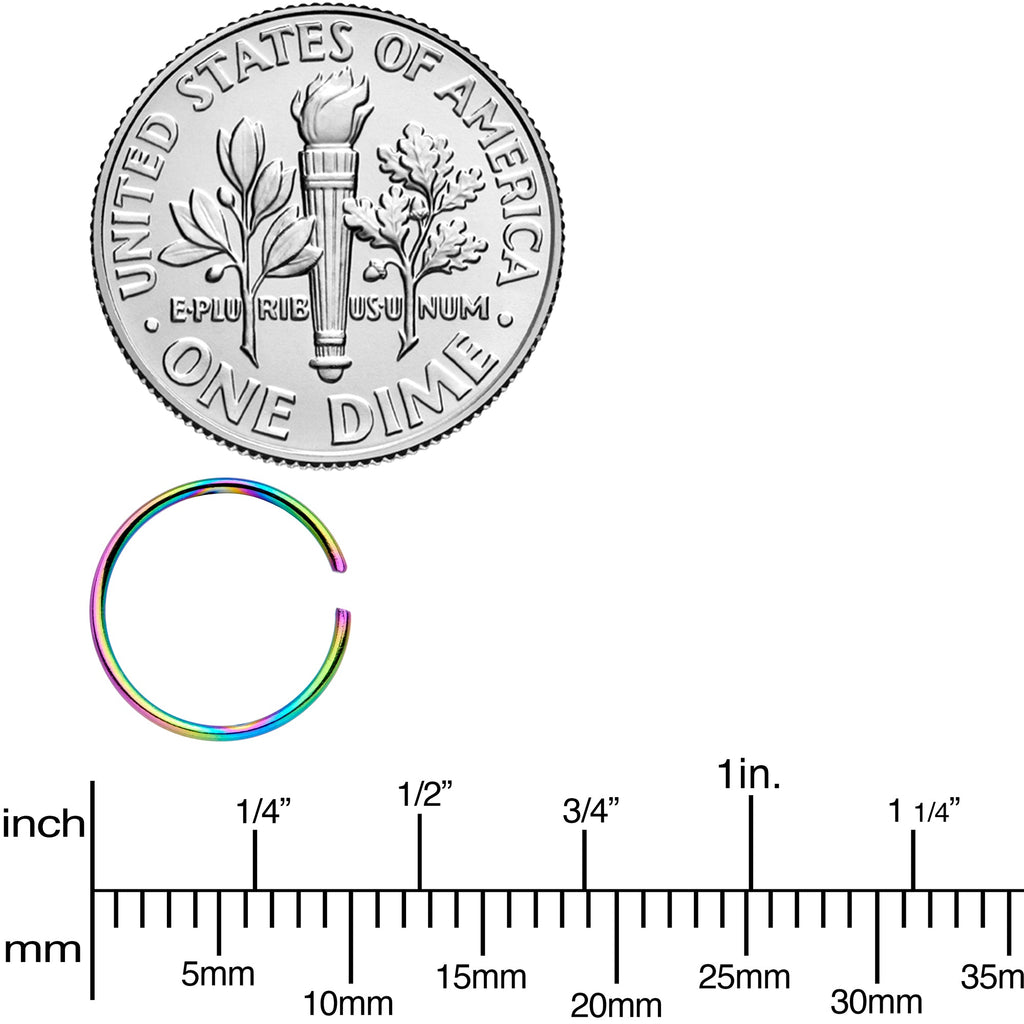 Whether you have multiple nostril piercings and prefer a matching look or are simply prone to losing things, this set of 22 gauge nose rings has you covered. They're made with 8mm rainbow anodized over 316L surgical grade stainless steel circular rings for a colorful and comfortable feel. This nostril jewelry is super easy to insert and remove - simply twist the ring open, insert, and then twist gently shut again. And with so many in the set, you can be sure of always having a beautiful nose ring to wear! Sold as a set of twelve.Specifications