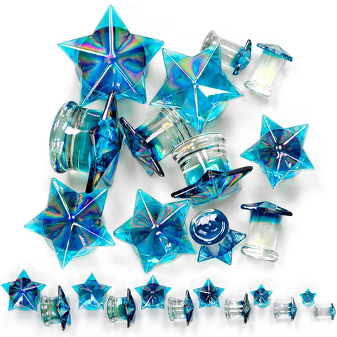 Blue Aurora Glass Faceted Star Double Flare Plug Set 6mm to 16mm Sizes