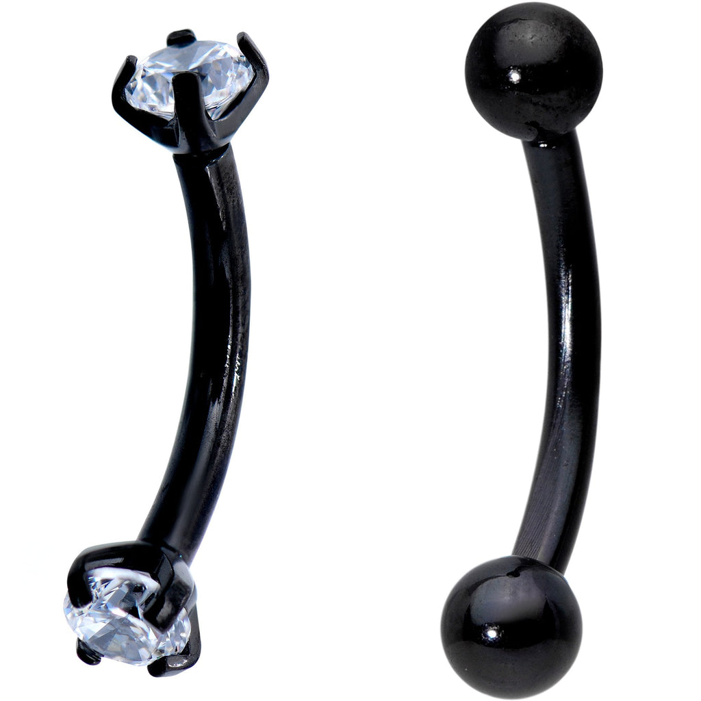 Add a new level of fun to your eyebrow jewelry collection with this set of six classic yet fun curved eyebrow rings. Each piece of curved barbell jewelry in this set is 16 gauge and features either 3mm ball ends or clear CZ gem ends. The pack comes with two sets of three colors: two gold PVD, two black PVD, and two standard 316L surgical grade stainless steel. One set of curved barbells features ball ends while the other features clear cubic zirconia ends for an extra bit of bling. Each eyebrow ring piercing is 8mm in length. Great for a new look every day! Sold as a set of six.Specifications