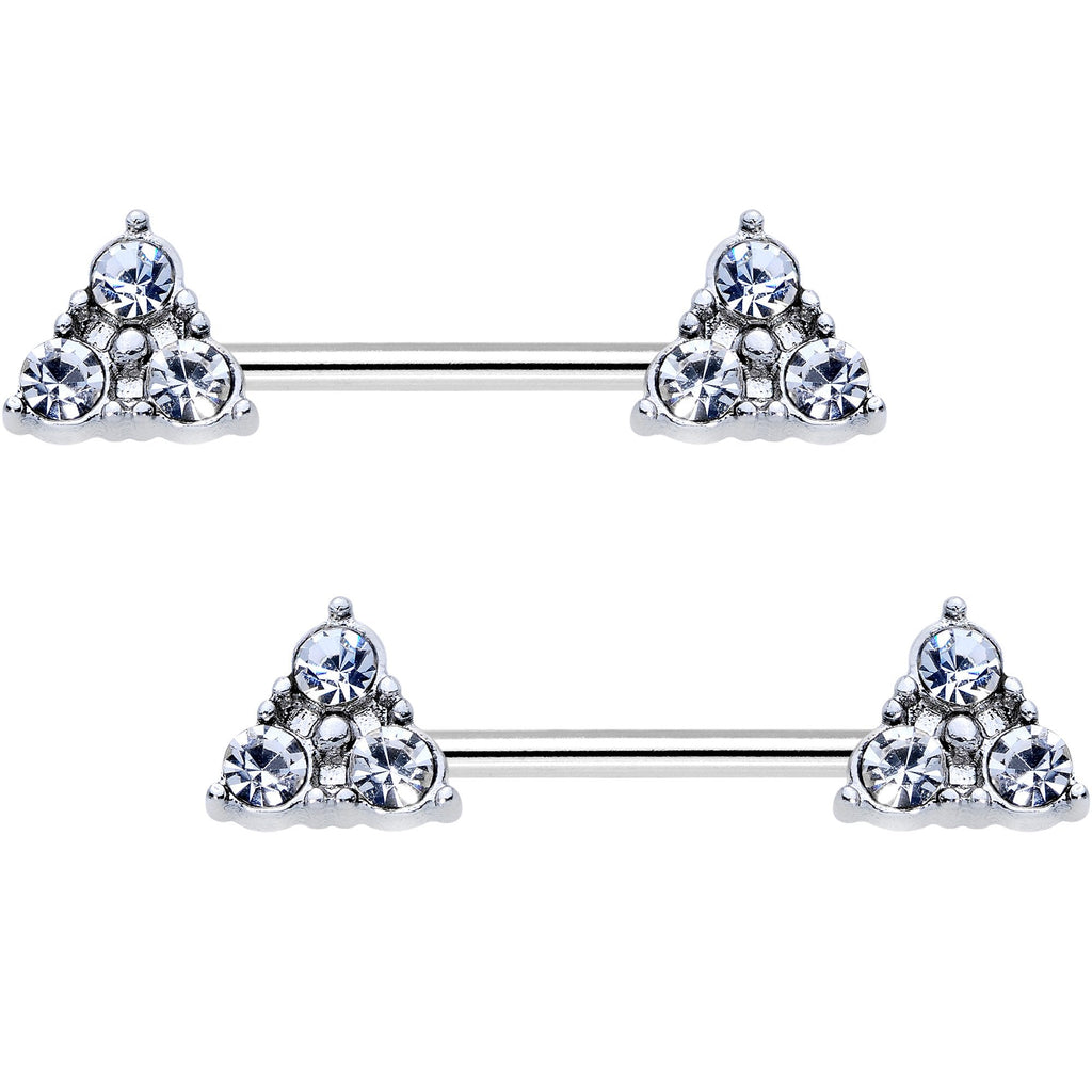 Express yourself with these stylish 14 gauge nipple barbells featuring a trio of pretty clear gems. These fun 10mm in length nipple barbells are made with durable 316L surgical grade stainless steel straight barbells and feature circular clear gem ends in a pyramid design. Sold as a set of two for you!Specifications