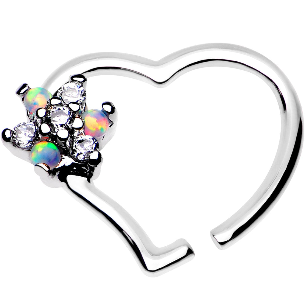 Love your ear candy? Show it off big time with this flashy 16 gauge daith cartilage earring. The 10mm diameter heart shaped seamless circular ring is made from durable 316L surgical grade stainless steel and includes a charm featuring white synthetic opals and clear cubic zirconia gems. This seamless circular earring can be used in a variety of cartilage piercings including the helix, rook, and daith.