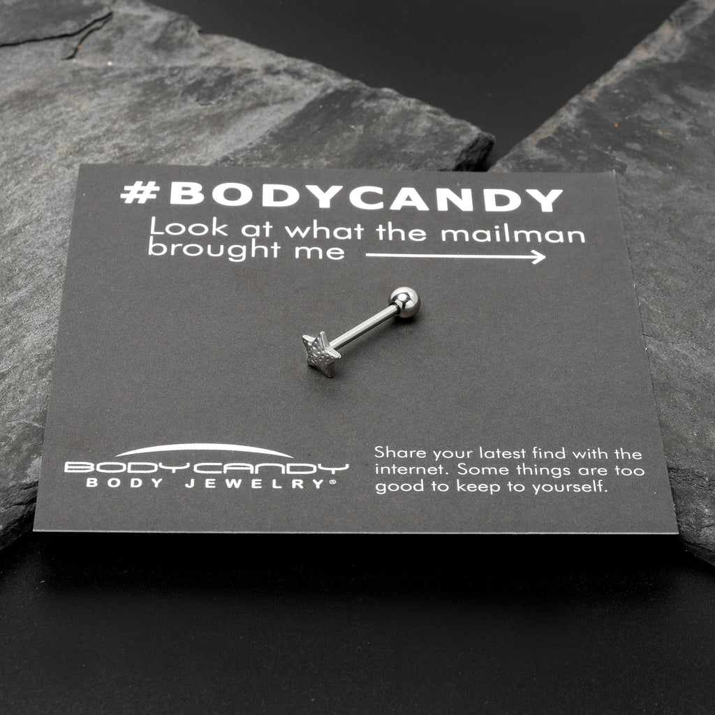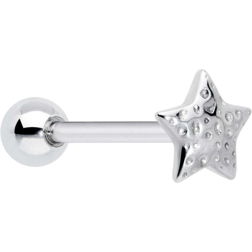 This 14 gauge tongue piercing ring is not just a beauty, it is a star. It is made with a 5/8 inch 316L surgical grade stainless steel straight barbell with a 5mm bottom ball end. The top end features an elegantly simple star charm with textured detailing for a stylish look. Let your words illuminate the heavens when you are rocking this simply elegant celestial tongue jewelry.Specifications
