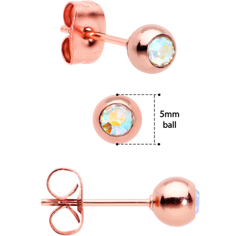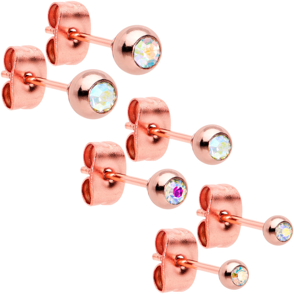 Simple meets stylish with these 20 gauge stud earrings! They're made with rose gold tone IP over 316L surgical grade stainless steel straight posts. They feature elegantly simple ball ends in three sizes, each set with an aurora gem to make as much of an impact as you could want! They even have butterfly-style friction backs for a secure fit. You can have simple style at every size with these classic ball earrings! Sold as a set of three.