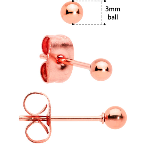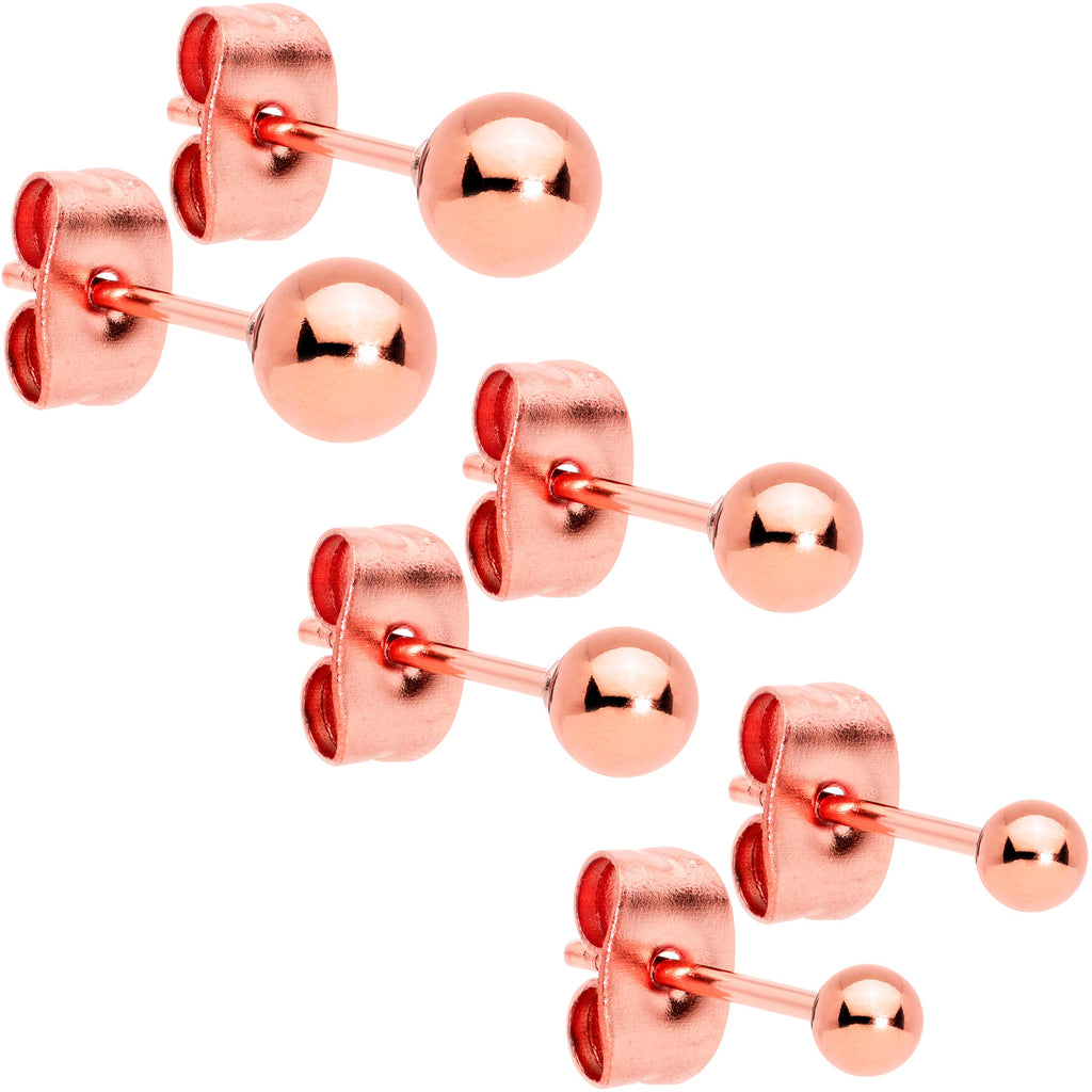 Simple meets stylish with these 20 gauge stud earrings! They're made with rose gold tone IP over 316L surgical grade stainless steel straight posts. They feature elegantly simple ball ends in three sizes, to make as much of an impact as you could want! They even have butterfly-style friction backs for a secure fit. You can have simple style at every size with these classic ball earrings! Sold as a set of three.Specifications