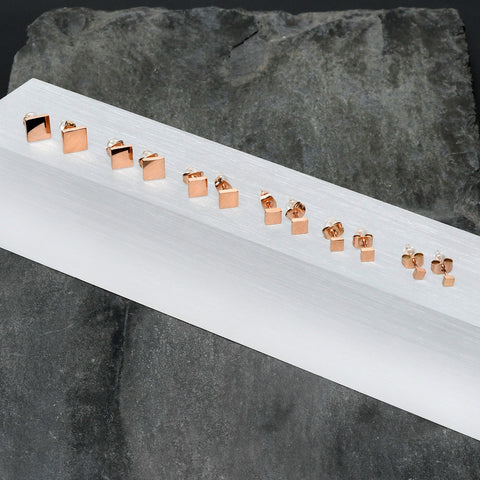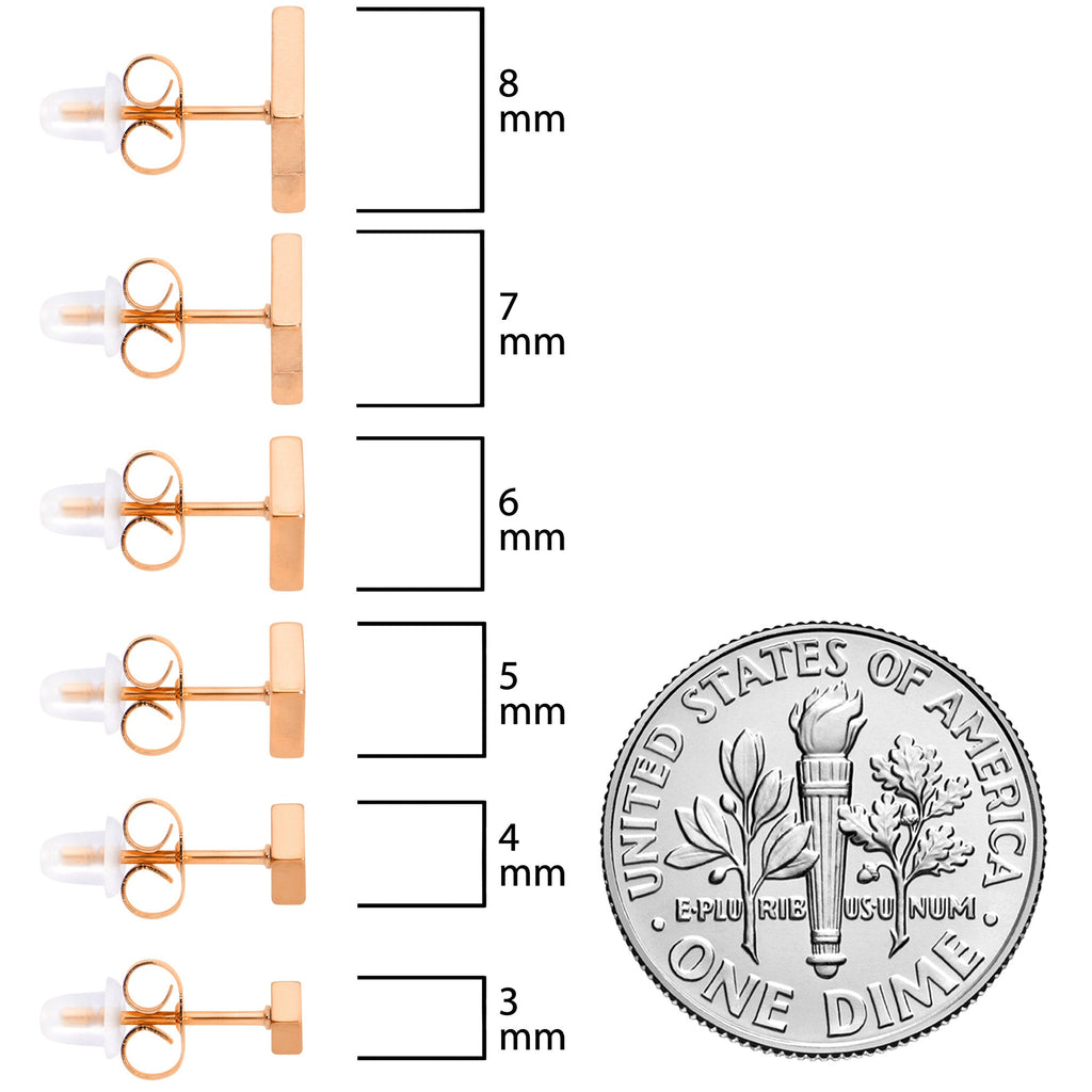 If you are looking for classic style that goes with everything, these 20 gauge earrings will have you ready for any occasion. They are made with rose gold tone PVD over 316L surgical grade stainless steel straight posts and have butterfly-style friction backs for a secure fit. They feature simple square ends with subtle style that will not overwhelm. You get one pair each in 3mm, 4mm, 5mm , 6mm, 7mm, and 8mm for a touch of classic chic to go with every look. These are sure to add some simple elegance to your pierced lobes. Sold as a set of six.Specifications