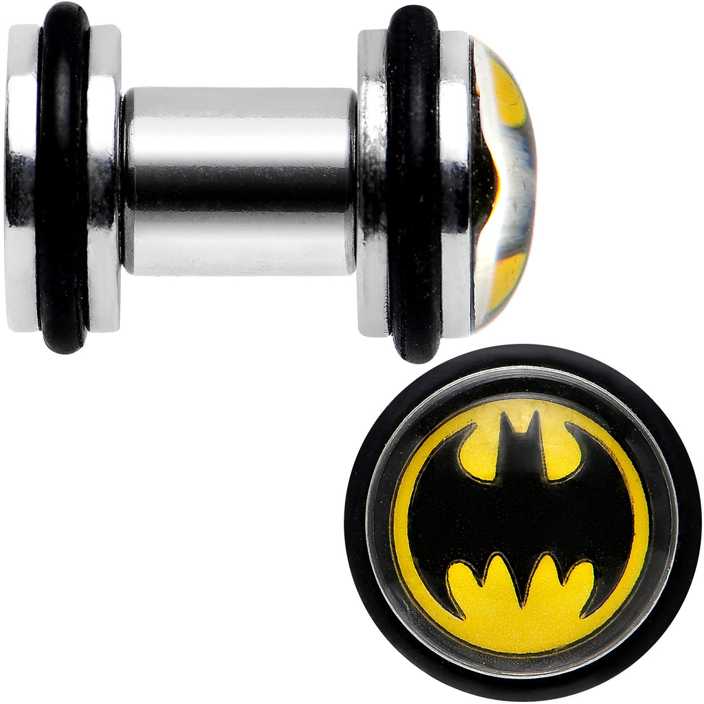 Hypoallergenic jewelry for sensitive skinThis 5mm mini ear plug set features two Batman logo ear plugs. Fashioned from stainless steel, they have an 8mm logo to create the illusion of a 0 gauge plug. Showcase Gotham City's own superhero with Batman logo faux plugs with screw fit backs for easy insertion. Yellow with black bat logo steel superhero screw fit ear plugs are sold as a pair of two (2). Batman is from DC Comics jewelry. Licensed cartoon ear plugs.