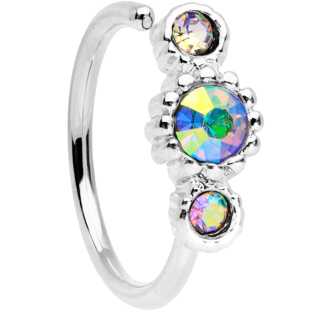 If you're into classic style this pretty 20 gauge nostril ring is right up your alley. Made with an adjustable 8mm durable 316L surgical grade stainless steel circular ring, this nose hoop features a fashion charm formed with three aurora cubic zirconia gems. This universal jewelry features ends that can be twisted open and then twisted shut again to easily to fit into your nose piercing. This universal body jewelry can be used for multiple piercings including your nostril, cartilage, or any other place that is a perfect fit for you!