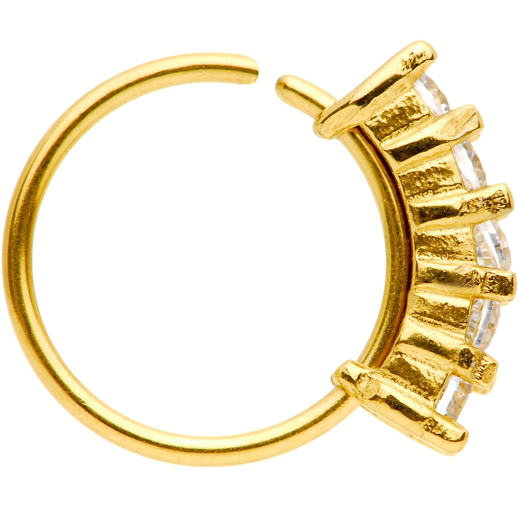 If you're into simple and easy to use universal jewelry this pretty 20 gauge cartilage ring is right up your alley. Made with an adjustable 8mm gold PVD over 316L surgical grade stainless steel circular ring, this cartilage hoop features a set of five sparkling clear cubic zirconia gems and ends that can be twisted open and then twisted shut again to easily to fit into your cartilage piercing.