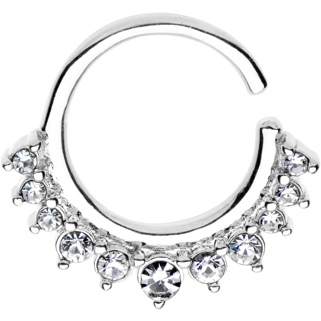 Everyone will want to call you "your highness" while you wear this queenly tiara circular ring. This 16 gauge circular ring features a half paved crown of beautiful clear gems to form a tiara-inspired design along the bottom rim. Made with an adjustable 8mm rhodium plated over brass circular barbell, this septum piercing features a bendable bar for easy insertion. Simply give this nose ring a gentle twist, insert into piercing, and bend shut for a perfect fit!