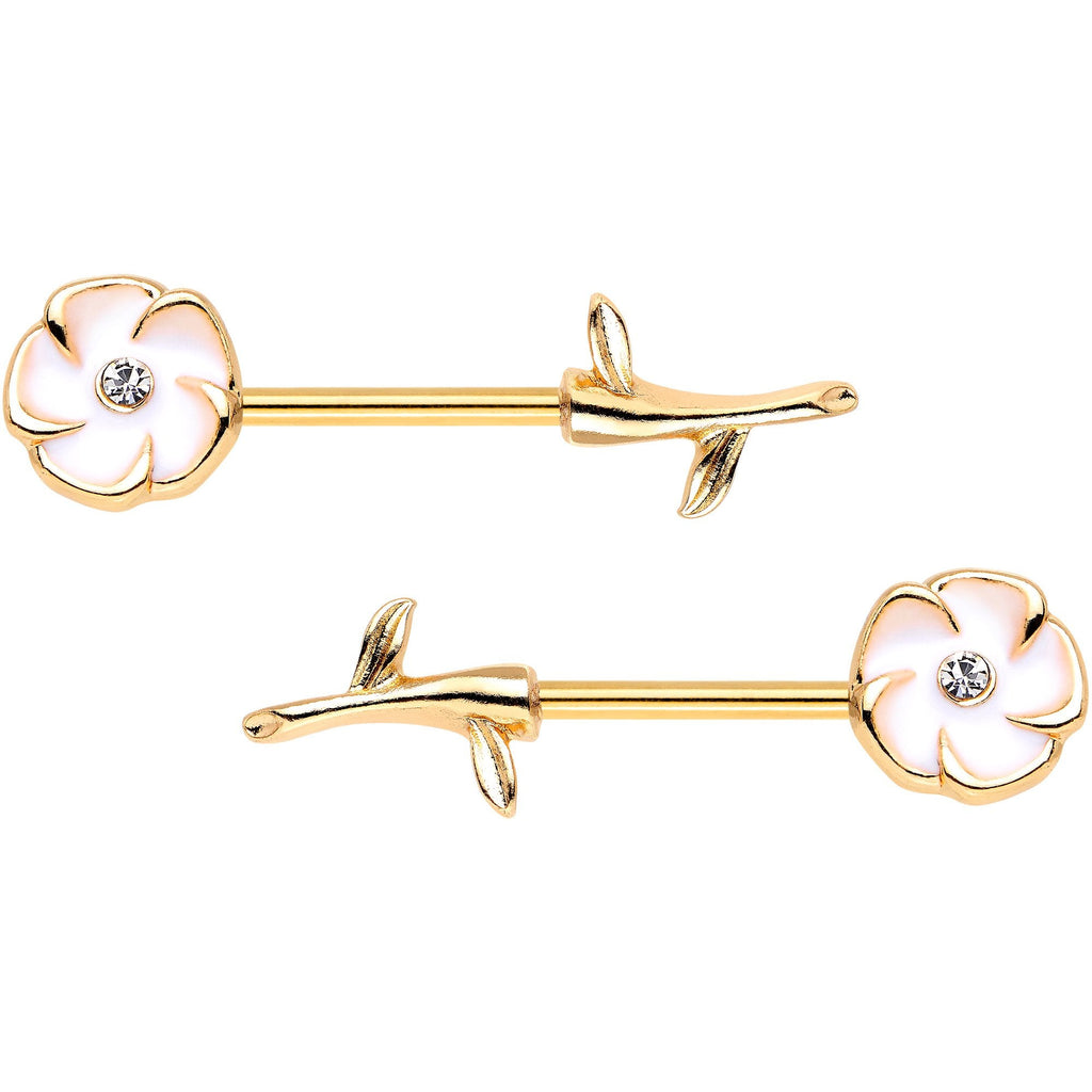 5/8" Clear Gem Gold PVD White Buttercup Flower Barbell Nipple Ring Set