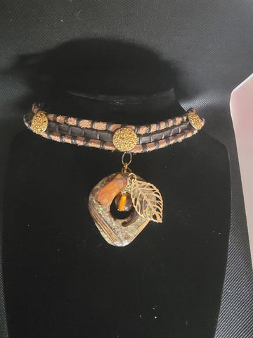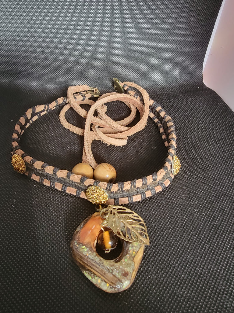 Hand woven leather cord choker and resin and wood charm that represent the Orisha Godess Ajá. Godess of the wild, forest, woods.