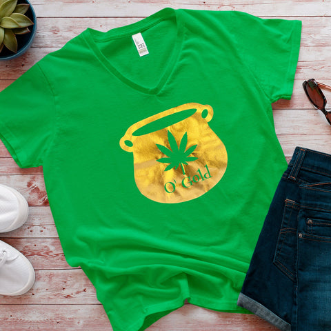 Pot Leaf Pot of Gold Green Frost V-Neck Tee Shirt