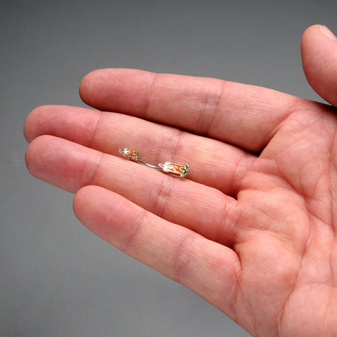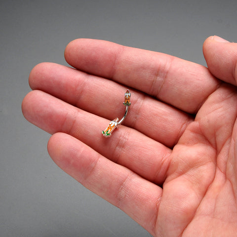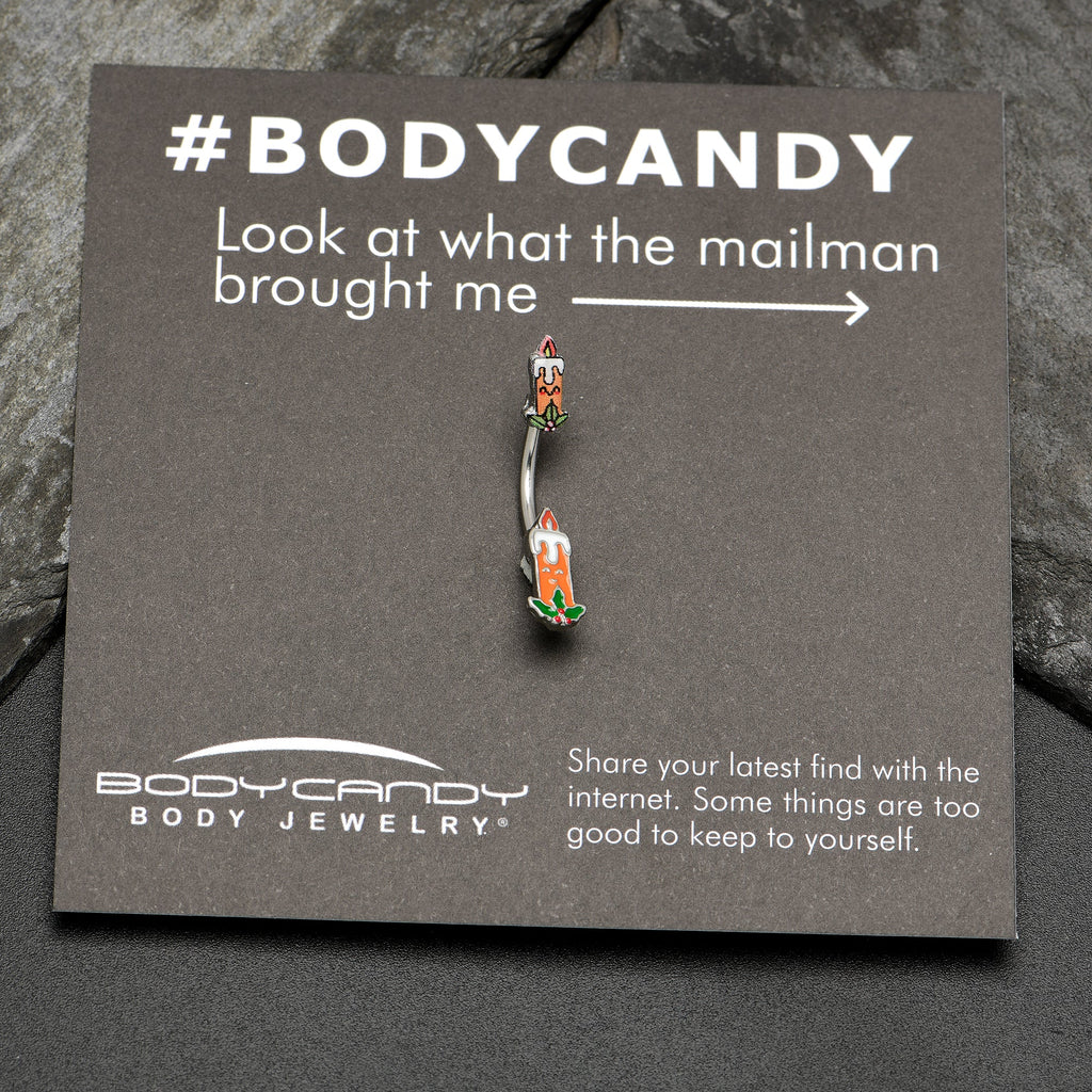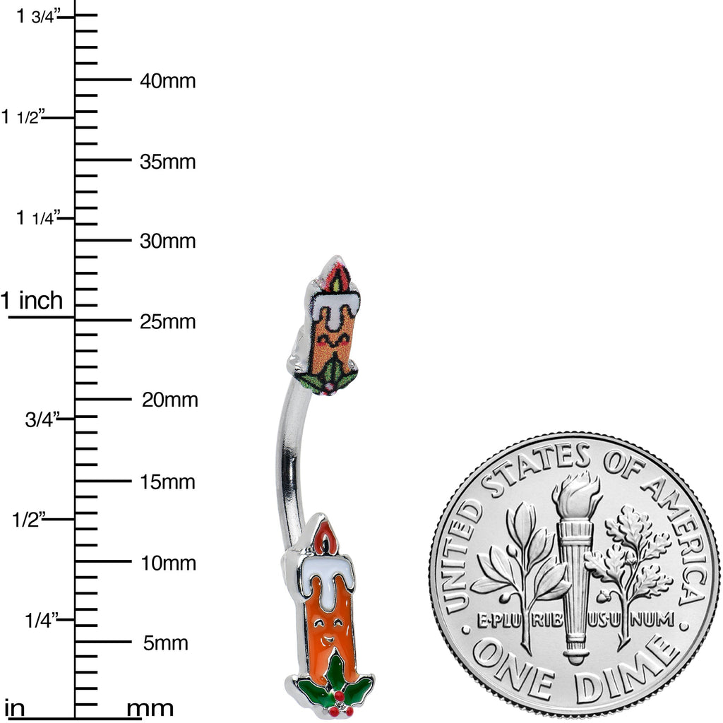 Keep the light in your piercings with this 14 gauge navel ring! It's made with a 3/8" durable 316L surgical grade stainless steel curved barbell. Each of the ends features a candle charm, with white embellishment. The candles are further embellished with an inlaid sprig of holly at their bases for a thoroughly festive feel. You'll be feeling the season when you're rocking this fun and festive belly piercing jewelry.Specifications